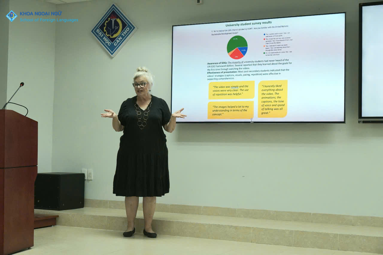 Tại 02 buổi trao đổi học thuật, Giáo sư Bilash đã trình bày nghiên cứu về việc sử dụng truyện tranh như một công cụ giáo dục trong quá trình dạy và học tiếng Anh tại Nhật Bản thông qua mô hình giảng dạy kết hợp giữa giáo viên người Nhật và giáo viên nước ngoài. Thông qua phương pháp giảng dạy này giúp ngưòi học phát triển năng lực giao tiếp liên văn hóa. Bên cạnh đó, Giáo sư Bilash trình bày 1 nghiên cứu hành động về việc giáo viên sản xuất 35 videos giáo dục bằng tiếng Anh phù hợp với trình độ A2, B1 và B2 để truyền đạt 17 mục tiêu cốt lõi trong các Mục tiêu phát triển bền vững của Liên Hiệp Quốc (UN SDGs). Phương pháp này không chỉ nâng cao năng lực ngôn ngữ mà còn góp phần hình thành tư duy toàn cầu, ý thức trách nhiệm xã hội và năng lực công dân thế kỷ 21 cho người học.