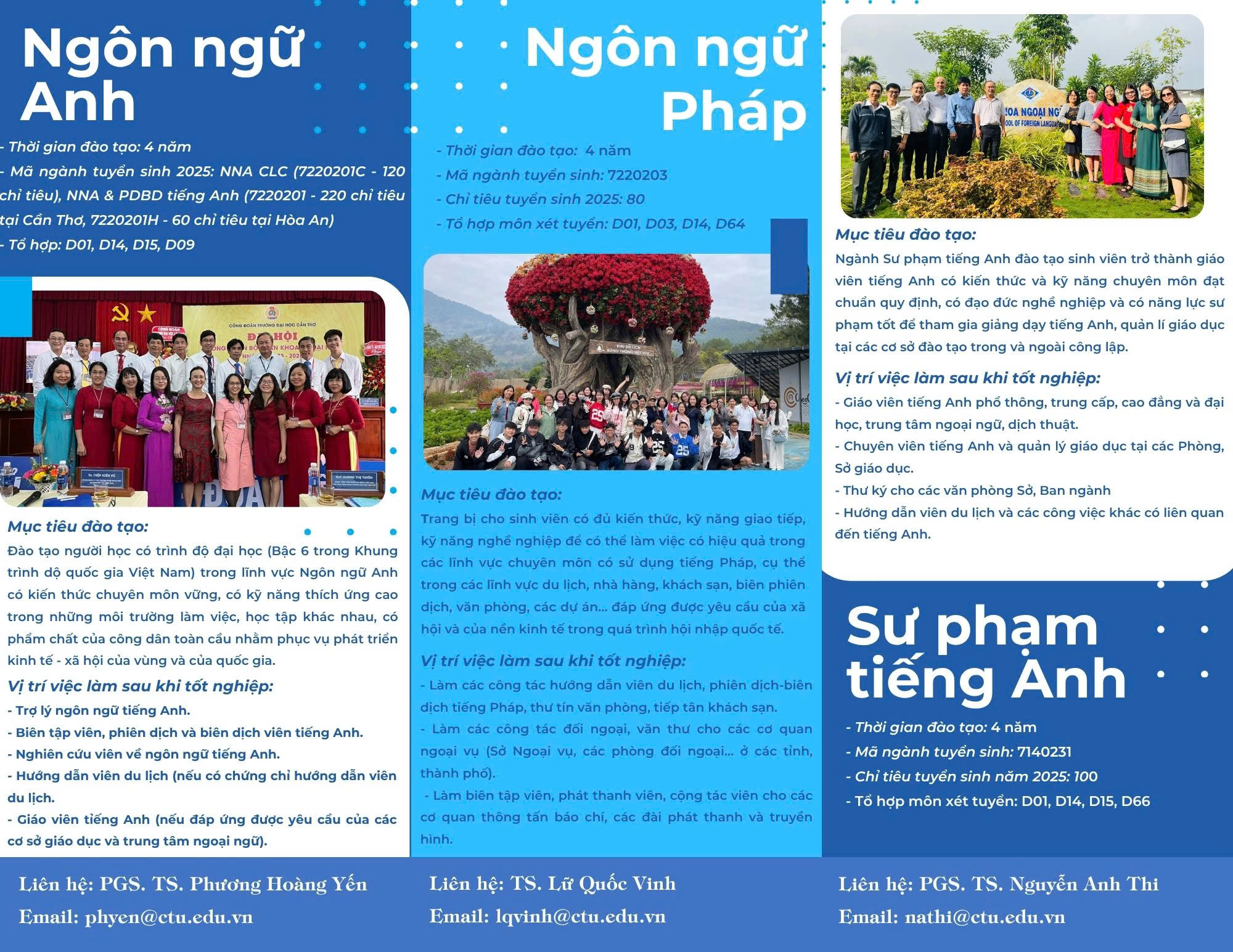 Khoa Ngoại ngữ - Đại học Cần Thơ là đơn vị đào tạo uy tín trong lĩnh vực ngôn ngữ và giảng dạy tiếng Anh, tiếng Pháp. Chúng tôi cung cấp các chương trình đào tạo chất lượng, đáp ứng nhu cầu học tập, nghiên cứu và hội nhập quốc tế của người học. Chúng tôi mang đến môi trường học tập năng động, chương trình đào tạo cập nhật và định hướng nghề nghiệp rõ ràng cho thế hệ hội nhập.